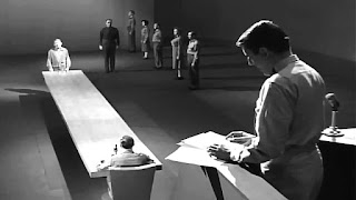 Expressionist sets and cinematology. Fritz Weaver and Burgess Meredith in an anti-totalitarian allegory.